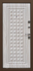 Коричневая входная дверь с зеркалом и внутренним цветом белый софт №10