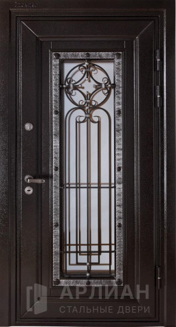 Двухстворчатая входная дверь со стеклом и ковкой №9